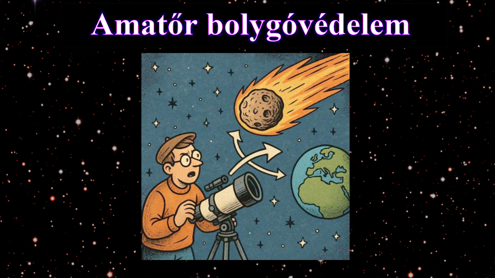 Amit nem tudunk, az az, hogy hol jár most és mikor ér ide. Ezek felderítése kritikus az emberiség jövője szempontjából. Minél több idő áll rendelkezésre a becsapódás előtt, annál hatékonyabb lehet a védekezés. Mióta ez a tény tudatosult a döntéshozók fejében, komoly összegeket fordítanak ezek felfedezésére. Kiváló égboltú helyszíneken hatalmas távcsövek pásztázzák az eget, kutatva a lehetséges becsapódó objektum után. Felmerül hát a kérdés, vajon amatőr eszközökkel, korlátozott anyagi háttérrel lehet-e érdemi felderítő munkát végezni, versenyezni a profikkal. Az előadásban ezt a kérdést igyekszünk körüljárni, személyes tapasztalatok alapján megvilágítani a jelent és felvázolni a lehetséges jövőt.