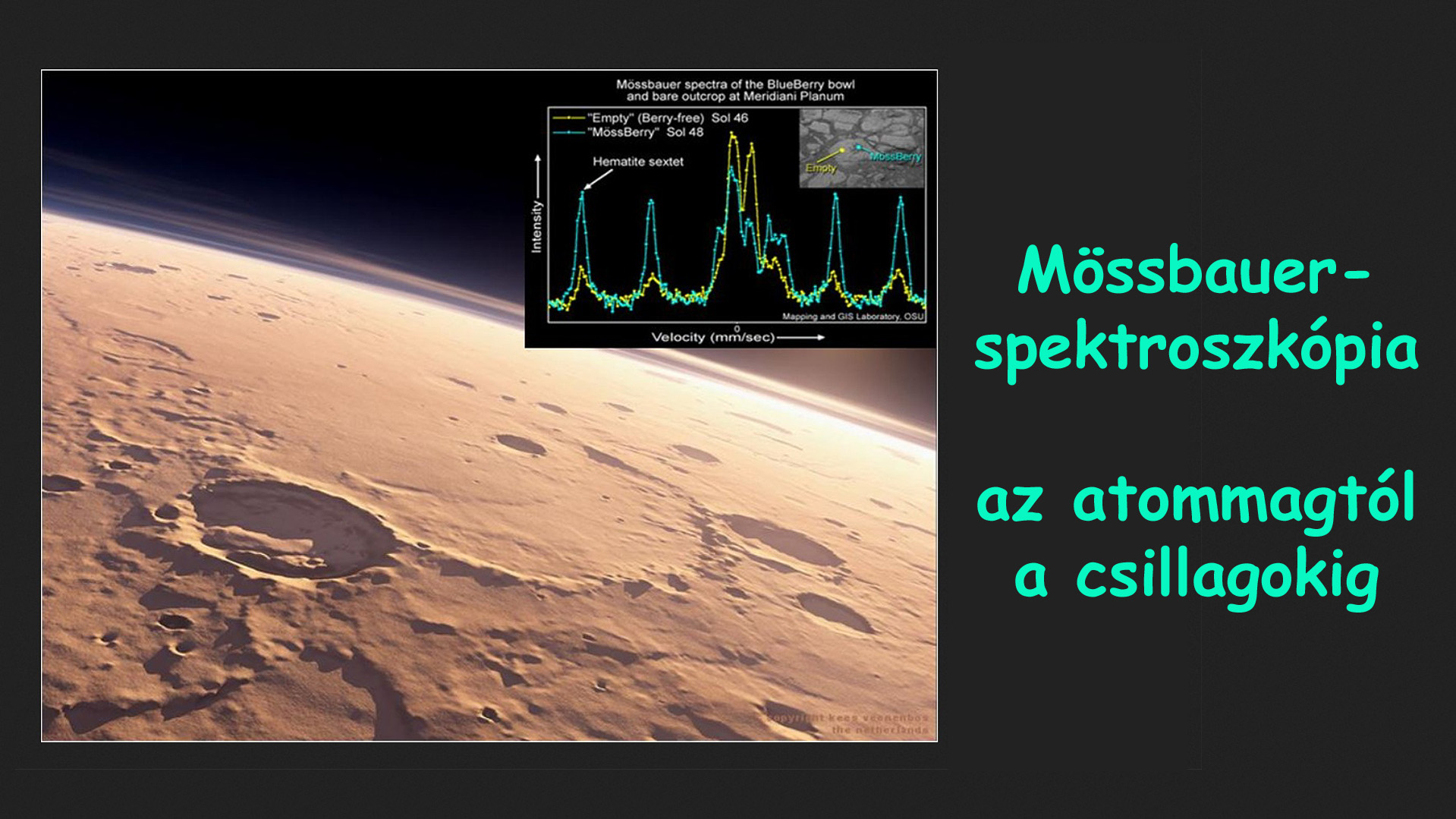 A Mössbauer-spektroszkópia, jóllehet közvetlenül az atommagok energiaállapotait vizsgálja, egyedi lehetőséget biztosít az atommag-elektron kölcsönhatásokon keresztül az elektronszerkezet vizsgálatára, méghozzá rendkívül nagy pontossággal. Előadásomban erről az érdekes spektroszkópiai módszerről szeretnék beszélni a gyakorlati felhasználásra fókuszálva. Bemutatom, hogyan jutott el a Mössbauer-spektroszkópia a Mars felszínére, és milyen izgalmas eredményeket mutatott a Mars kőzeteinek összetételéről, eredetéről. (Az előadó Kovács Krisztina magkémikus, az ELTE Kémiai Intézetének adjunktusa.)