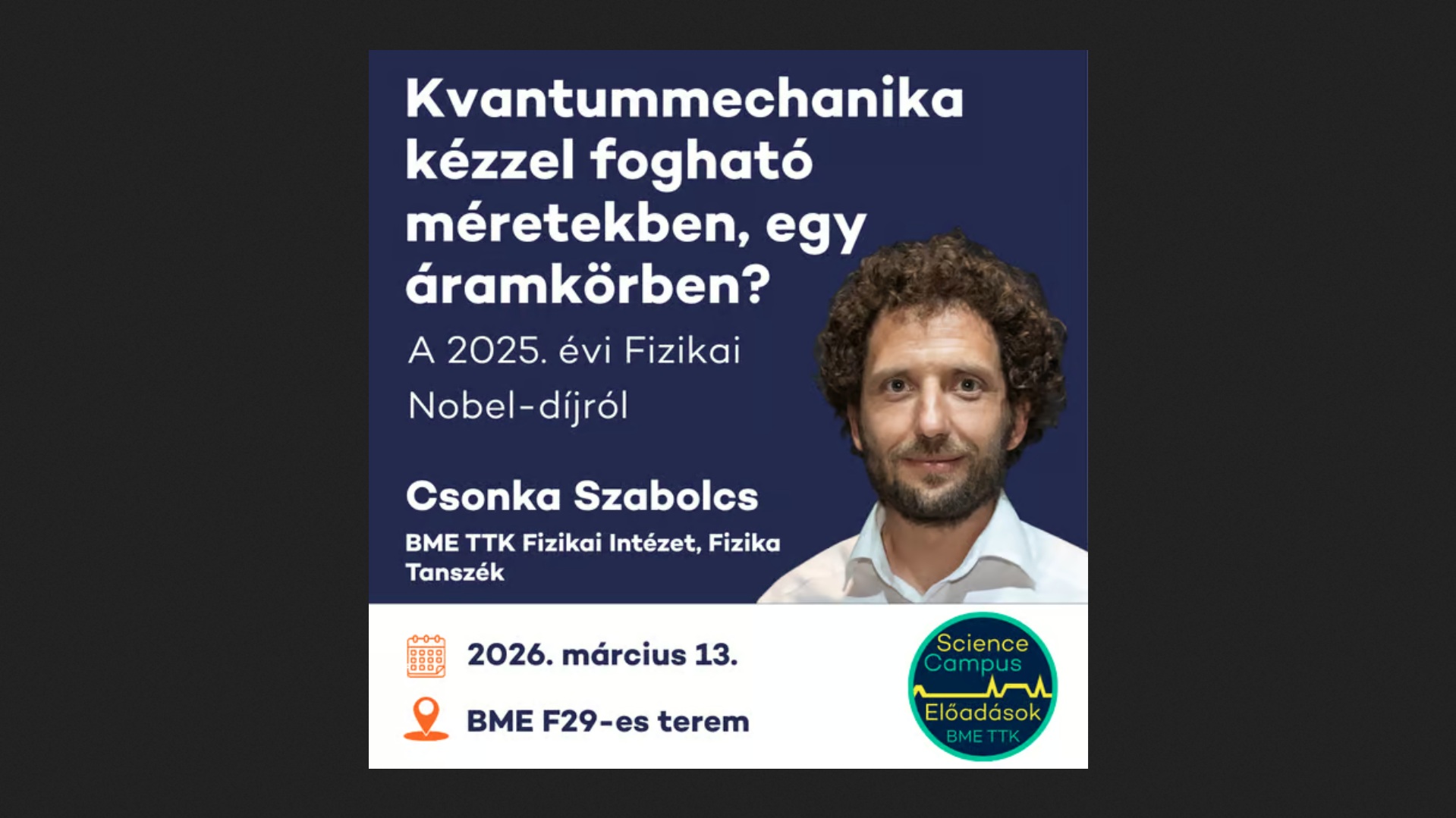 Kvantummechanika törvényeivel leginkább a nanovilágban találkozunk, például az atomok, elektronok leírásánál. Hogy jelentkezhet ez egy kézzelfogható méretű áramkörben? És miért fontos ez a mai kvantumszámítógépekben? Ezeket a kérdéseket fogjuk körbejárni középiskolásoknak szóló előadásunkban. Az előadás helyszíne a BME F29 terem. További információ: https://felvi.ttk.bme.hu/sciencecampus